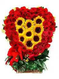 corazon de 48 rosas y 8 girasoles Con Mensaje Personalizado, máximo de 30 caracteres (Dejar el mensaje en el chat, los comentarios no se previsualizan para la tienda por lo que si se dejan allí no podrá ser incluido)