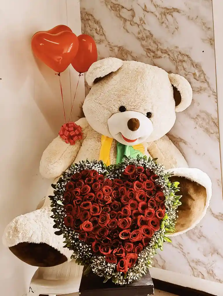 HERMOSO CORAZON EN ROSAS Y OSO GIGANTE