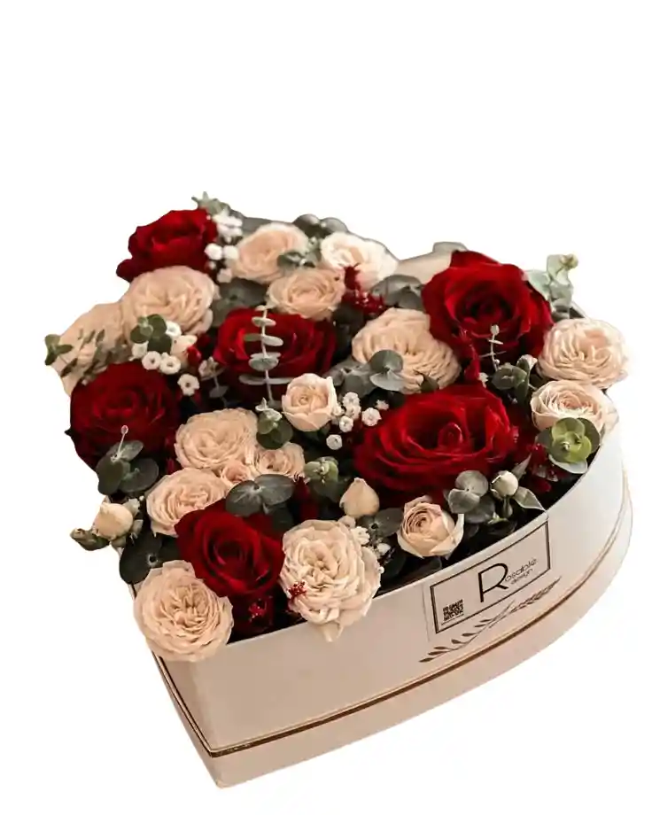 Caja en forma de corazón con 6 rosas rojas y rosas mini blanca acompañado de eucalipto Nota: La flor puede ser sustituida dependiendo la disponibilidad de color y del producto “Mensaje Personalizado” máximo de 30 caracteres (Dejar el mensaje en el chat, los comentarios no se previsualizan para la tienda por lo que si se dejan allí no podrá ser incluido).