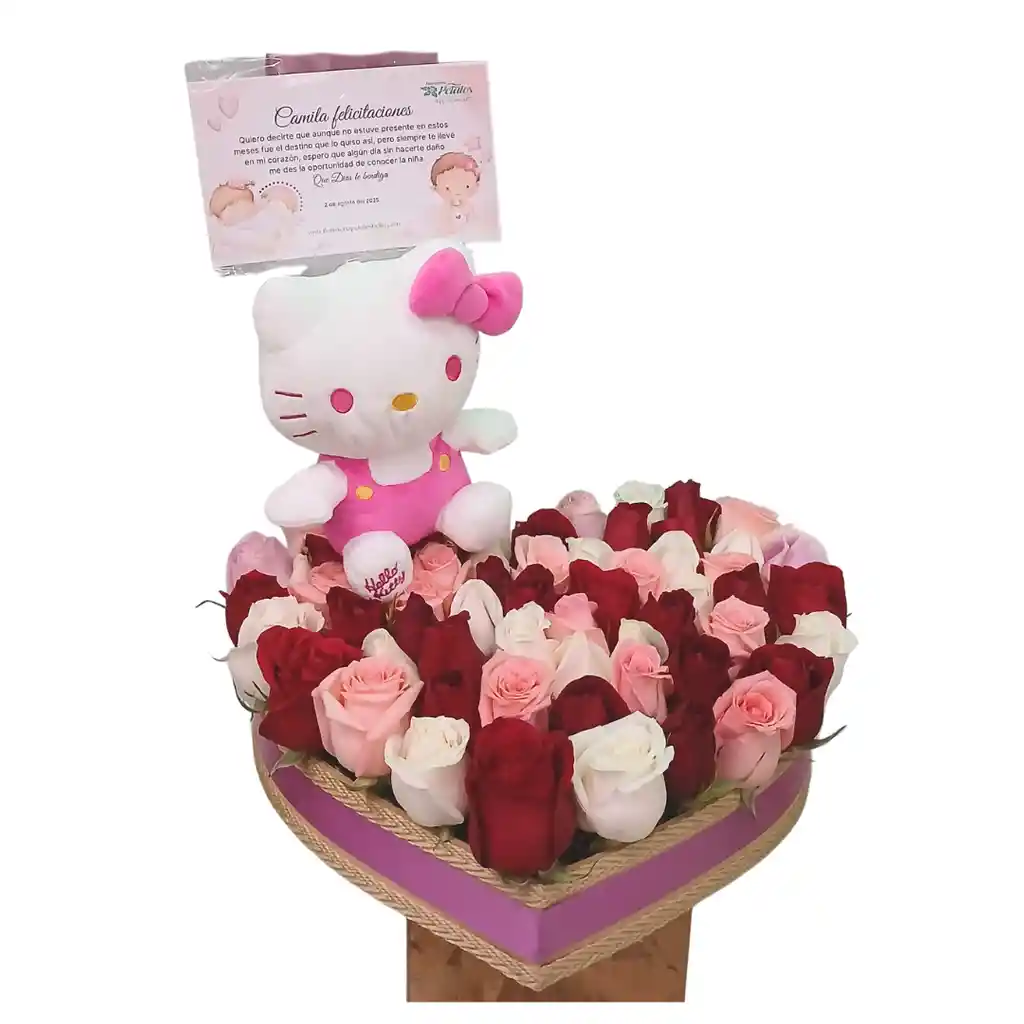 Hermoso arreglo floral de rosas en forma de corazón grande en colores rojo, rosa y blanco, con peluche de Hello Kitty, perfecto para toda ocasión.