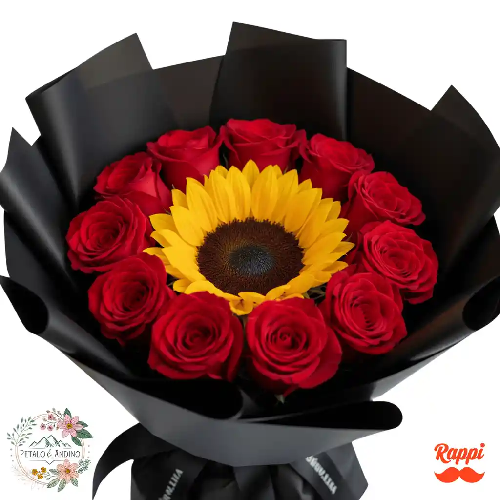 Un hermoso ramo que combina la pasión de doce rosas rojas con la alegría y luminosidad de un girasol central. Cuidadosamente envuelto en elegante papel coreano (el color puede variar según disponibilidad), este arreglo floral es perfecto para expresar amor, gratitud o celebrar momentos especiales.