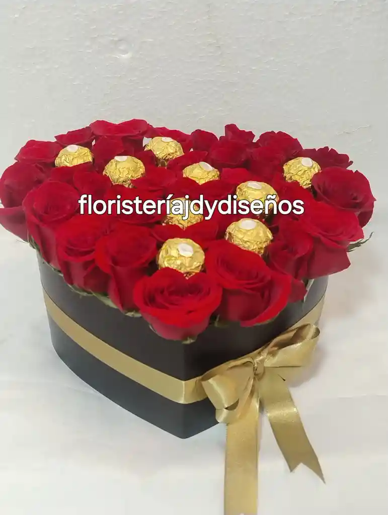 CORAZON EN CAJA DE LUJO CON ROSA ROJA TIPO EXPORTACION Y 9 UNIDADES DE CHOCOLATES FERRERO, CON MOÑO DE CINTA DE TELA