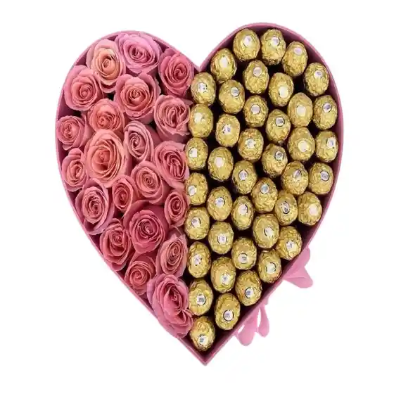 BASE EN FORMA DE CORAZON ROSADO, 22 ROSAS, 24 CHOCOLATES FERRERO, LAZO EN CINTA
