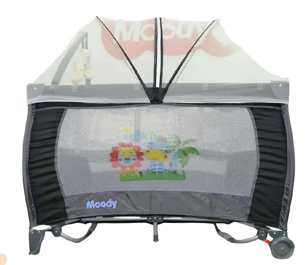 Dos niveles (Cuna-Corral). Práctico toldillo Camping. Cambiador. Barra con entretenedores. Rodachinas. Mallas laterales para mantener una temperatura fresca. Fácil plegado. Telas impermeables. Tula de viaje. Negro Gris
