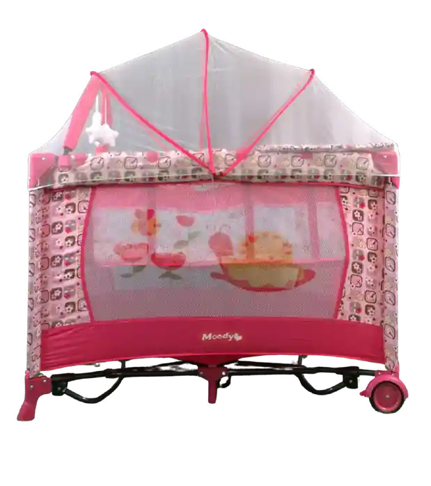 Dos niveles (Cuna-Corral). Práctico toldillo Camping. Cambiador. Túnel gateador Barra con entretenedores. Rodachinas. Mallas laterales para mantener una temperatura fresca. Fácil plegado. Telas impermeables. Tula de viaje.