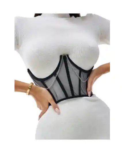 Corset superior tipo bustier con cadenas Talla: S – Poder y estilo en una sola pieza Transforma cualquier outfit con este corset estructurado que mezcla elegancia, actitud y diseño moderno. 👗 Características del producto: Diseño tipo bustier con varillas verticales que moldean la figura Color negro clásico, ideal para combinar con vestidos, blazers o prendas ajustadas Detalles metálicos: cadenas decorativas plateadas y aros que aportan un toque edgy Cierre posterior y correas ajustables para mejor ajuste Perfecto para looks urbanos, alternativos o de noche Una prenda que eleva tu estilo y te hace destacar con fuerza y sofisticación. ¡Ideal para quienes aman la moda con carácter!