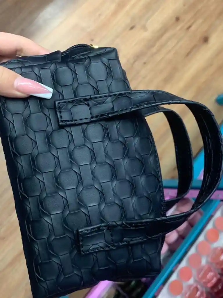 Es un estuche de maquillaje negro con textura tejida
