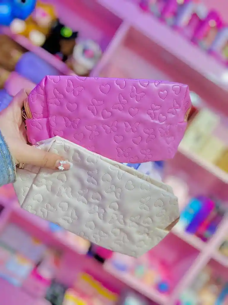 ¡La cosmetiquera más romántica y espaciosa llegó a tu tienda! 💜 Este neceser tipo baúl es la combinación perfecta de capacidad y un diseño adorable gracias a su textura acolchada de corazones y mariposas en relieve. Diseño Único: Patrón embossed súper femenino y chic que le da un look 3D. Forma Baúl: La base ancha te da el espacio extra que necesitas para guardar todos tus productos de maquillaje y skincare. Colores Pop: Disponible en tonos vibrantes y pastel: Negro, Morado Lavanda, Rosa y Crema. El color de tu cosmetiquera se envía según disponibilidad de la tienda. ¡Todos los colores son divinos! ¡Pídela ahora y organiza tu belleza con un toque de dulzura y glamour