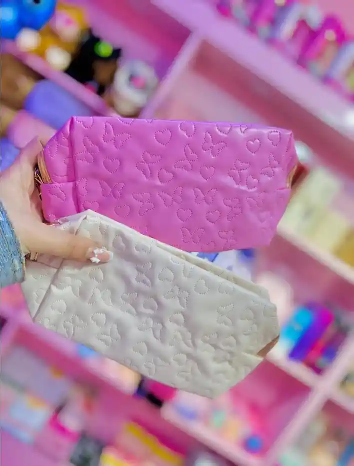 ¡La cosmetiquera más romántica y espaciosa llegó a tu tienda! 💜 Este neceser tipo baúl es la combinación perfecta de capacidad y un diseño adorable gracias a su textura acolchada de corazones y mariposas en relieve. Diseño Único: Patrón embossed súper femenino y chic que le da un look 3D. Forma Baúl: La base ancha te da el espacio extra que necesitas para guardar todos tus productos de maquillaje y skincare. Colores Pop: Disponible en tonos vibrantes y pastel: Negro, Morado Lavanda, Rosa y Crema. El color de tu cosmetiquera se envía según disponibilidad de la tienda. ¡Todos los colores son divinos! ¡Pídela ahora y organiza tu belleza con un toque de dulzura y glamour