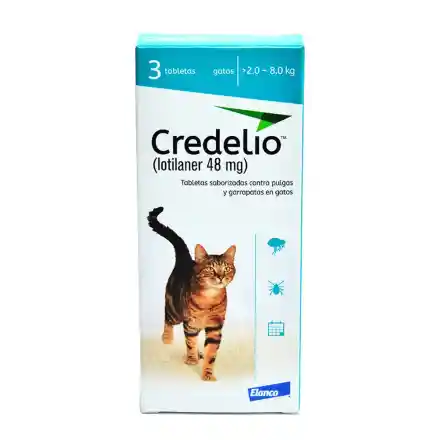Credelio es un antiparasitario oral sistémico para gatos que pesen entre 2 y 8 kg, formulado para ofrecer protección contra pulgas adultas y garrapatas durante un mes. Su principio activo, lotilaner, actúa rápidamente tras la ingestión y con exposición con comida para asegurar eficacia sostenida. Además ayuda a controlar la dermatitis alérgica por pulga (DAP) al eliminar pulgas antes de que pongan huevos. Su presentación en comprimidos masticables y saborizados facilita la administración.