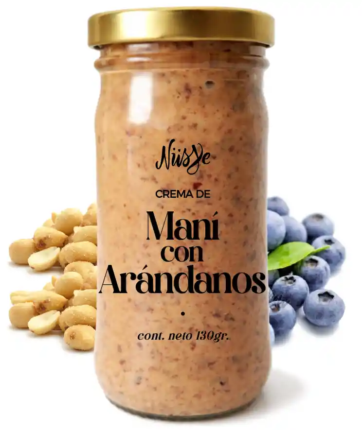 Crema de maní con arándanos x 140gr. Maní con arándanos deshidratados. Endulzado con panela. 100% natural. Libre de aceites añadidos. Libre de gluten. Producto vegano.