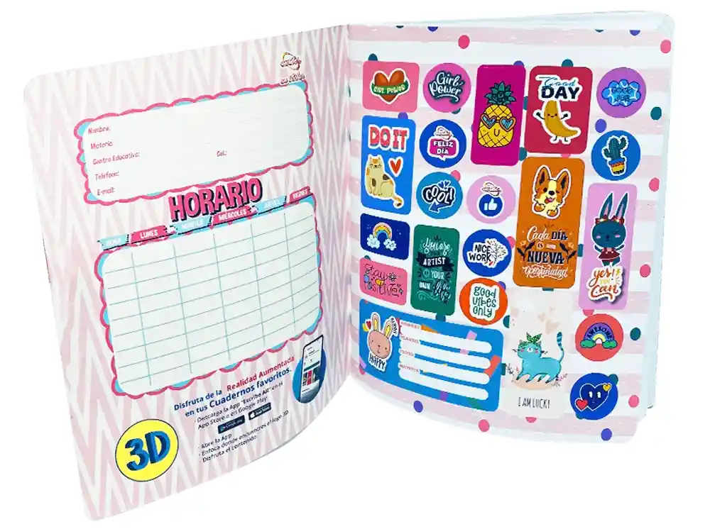 Incluyen una o más hojas de stickers (pegatinas) con diferentes diseños y temáticas, que permiten la personalización del cuaderno o de otros objetos.
