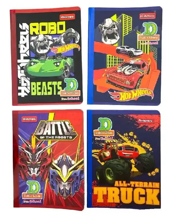 CUADERNO COSIDO Motivo surtido, robots, truck, hotwheels CON STIKER 100 HOJAS DOBLE LINEA MARCA PRIMAVERA. DISEÑOS SURTIDOS. SE ENVÍA DISEÑO SEGÚN DISPONIBILIDAD (Pre- school) .
