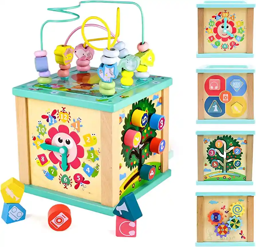 Cubo Alambrado de actividades de madera para bebés de 12 a 18 meses, juguete Montessori para 1 año de edad, centro de laberinto de cuentas, el mejor regalo para tu hijo, regalo de cumpleaños, aprendizaje para 1, 2, 3 años en adelante, niños y niñas! Juguetes de aprendizaje para bebés: los juguetes de centro de actividades de madera incluyen 6 superficies de juego diferentes, juego de laberinto de cuentas, árboles deslizantes, juguete de reloj giratorio, clasificador de formas y engranajes giratorios. Juguetes creativos de Montesori: el cubo de actividad de 6 a 12 meses puede desarrollar habilidades de coordinación ojo-mano, reconocimiento de color, habilidad de conteo, combinación de formas, conciencia del tiempo. Mejora las habilidades motoras y de pensamiento lógico de los niños.
