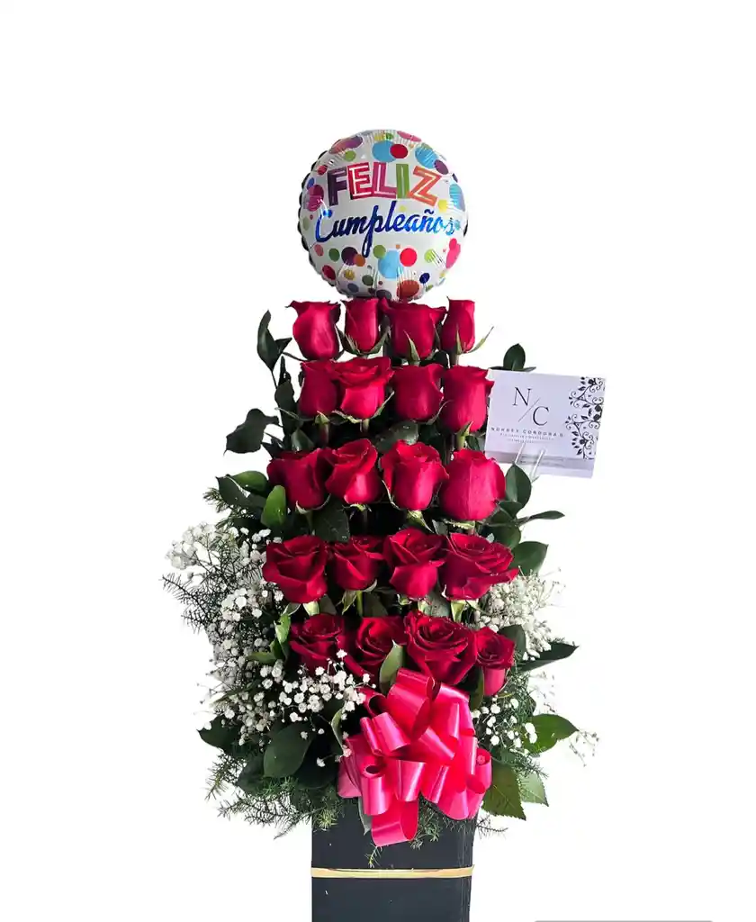 Arreglo floral elaborado en cubo de madera negra con 20 rosas rojas, globo metalizado de cumpleaños pequeño, complementos verdes y moño decorativo