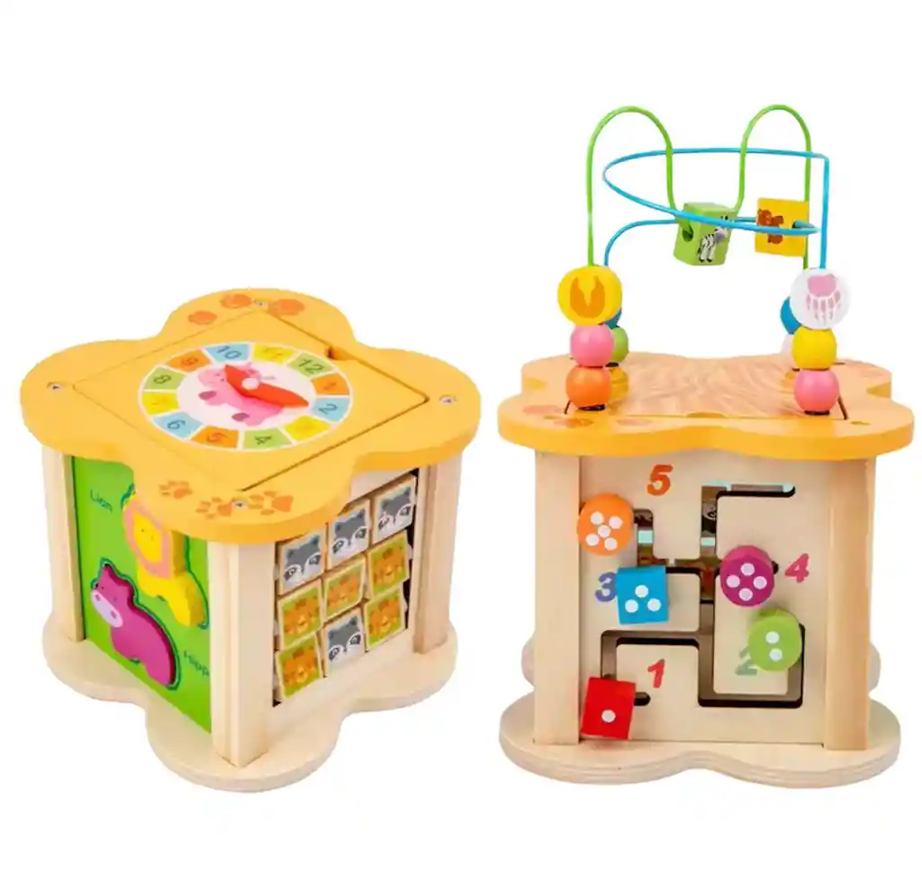 Juguete educativo integral diseñado para estimular el desarrollo temprano a través del juego activo, sensorial y cognitivo. Este cubo multifuncional reúne 6 actividades diferentes en un solo juguete, permitiendo al bebé explorar formas, sonidos, colores, movimientos y texturas desde distintos ángulos. Cada cara del cubo ofrece una experiencia distinta que mantiene el interés y favorece el aprendizaje progresivo. Fabricado en material resistente y seguro, con bordes redondeados y piezas de tamaño adecuado para manos pequeñas. Sus colores llamativos y elementos interactivos están pensados para captar la atención y reforzar el aprendizaje visual y táctil. Funciones y actividades: Encaje de formas para reconocimiento de figuras y colores. Engranajes y piezas móviles que estimulan la coordinación y la lógica. Laberinto o cuentas deslizables para motricidad fina. Elementos giratorios y deslizantes para exploración sensorial. Paneles interactivos que refuerzan causa y efecto. Actividades manipulativas inspiradas en el método Montessori. Beneficios educativos: Desarrolla la motricidad fina y coordinación mano-ojo. Estimula el pensamiento lógico y la resolución de problemas. Fomenta la concentración y la autonomía. Potencia el reconocimiento de formas, colores y texturas. Apoya el aprendizaje temprano de manera natural y divertida. Ideal para bebés y niños en etapa de primera infancia. Perfecto para el hogar, guarderías o como regalo educativo. Un solo cubo, múltiples aprendizajes, horas de juego inteligente.