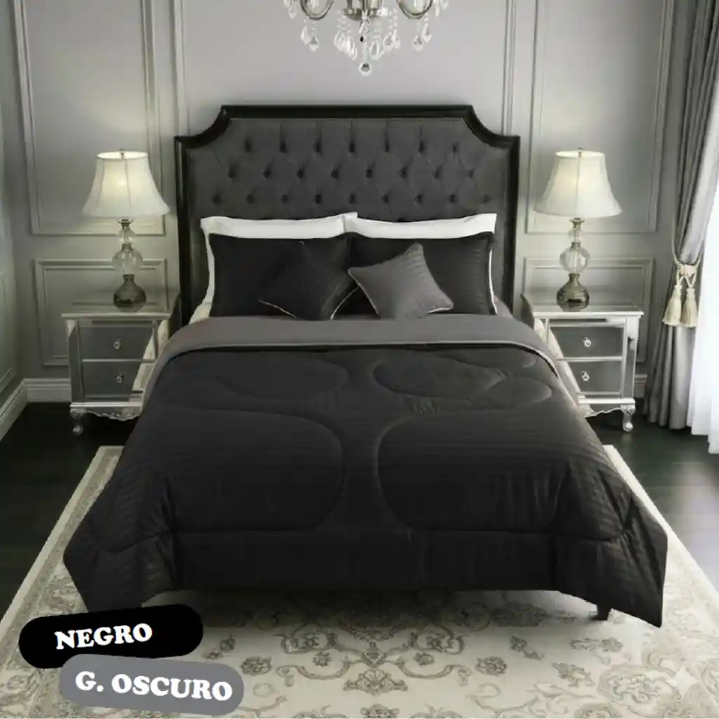 Cubrelecho Doble Negro-Gris 5 Piezas Medidas: Para cama doble 140 x 190 cm Edredón: 220x240 cm Dos fundas: 50x70 cm Dos cojines: 35x35 cm Cubrelecho de alta calidad, clásico y elegante que destaca por su simplicidad y versatilidad. Microfibra unicolor 100% poliéster Relleno de fibra siliconada Costura especial que asegura el relleno a largo plazo Apariencia ordenada y serena Ideal para quienes prefieren un ambiente relajante y armonioso en su dormitorio Hecho en Colombia Cubrelecho, Cubrecama, Edredon, Plumon