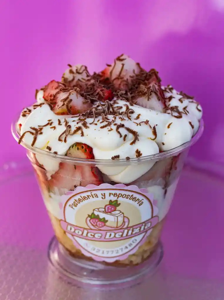 Capas de torta remojada en tres leches, crema artesanal y fresas frescas. Un postre delicado, suave y lleno de sabor natural. Coronado con chocolate y trozos de fruta.