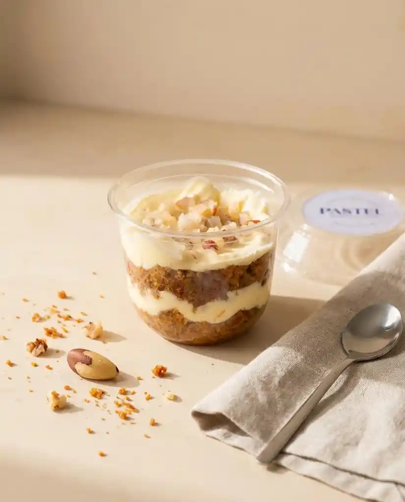 Capas de torta de zanahoria húmeda y especiada, con nueces troceadas y crema de queso suave. Un equilibrio perfecto entre textura, dulzor y sabor casero en cada cucharada.