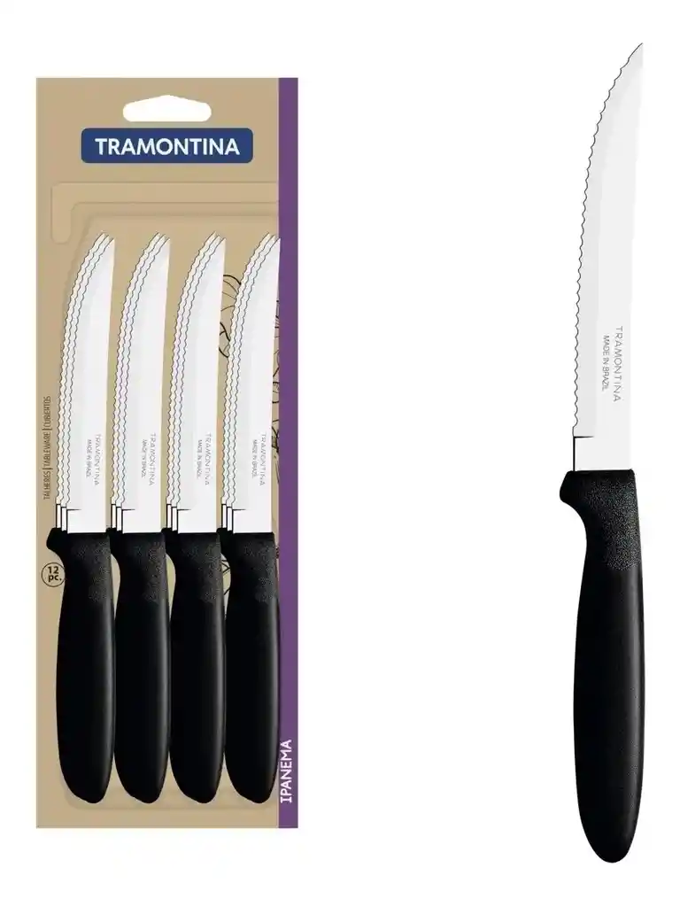 Cuchillo asado de 5" sus láminas en acero inoxidable, el tratamiento térmico permite se mantenga el filo durante más tiempo, sin rayar la porcelana ESPECIFICACIONES Marca: Tramontina Material: Acero inoxidable, Polipropileno Medidas: Largo (28 cm) Ancho (10 cm) Alto (3 cm) Peso 1 kg Color: Negro Referencia: 23360/905 / SKU: 020678 Hecho en: Brasil Garantía: 1 año (Por filo o desprendimiento de mango) INCLUYE: 12 piezas Acero inoxidable con un espesor que garantiza alta resistencia y durabilidad. Con bordes pulidos que evitan accidentes al momento de comer Su mango en polipropileno en color negro que combina con cualquier ambiente Se pueden lavar diariamente en lavavajillas Garantía del vendedor: 1 meses