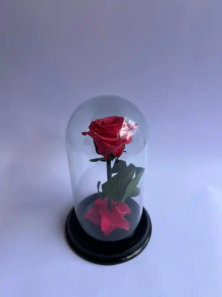 ROSA TALLO MINI NATURAL PRESERVADA EN ELEGANTE CUPULA DE VIDRIO CON BASE DE MADERA DECORADA ADEMAS CON PETALOS Y HOJAS, NO NECESITAN CUIDADOS Y LA PUEDES DISFRUTAR POR AÑOS