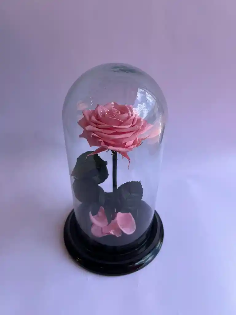 ROSA TALLO PREMIUM NATURAL PRESERVADA EN ELEGANTE CUPULA DE VIDRIO CON BASE DE MADERA DECORADA ADEMAS CON PETALOS Y HOJAS, NO NECESITAN CUIDADOS Y LA PUEDES DISFRUTAR POR AÑOS