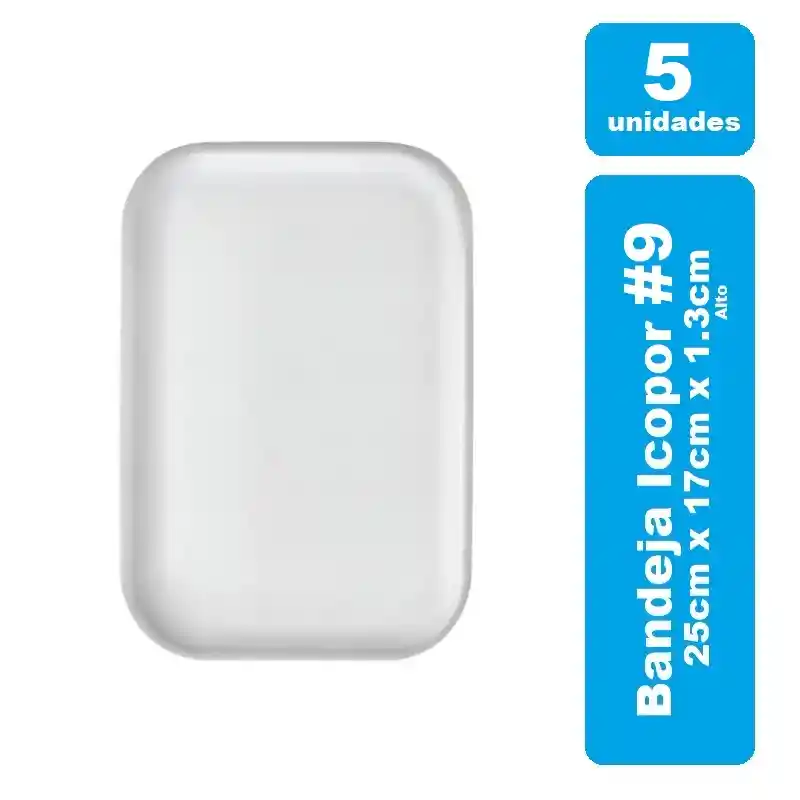 Bandeja Icopor # 9 color Blanco lo cual tiene une medida externa de 25cm x 17cm y una profundidad de 1.3cm