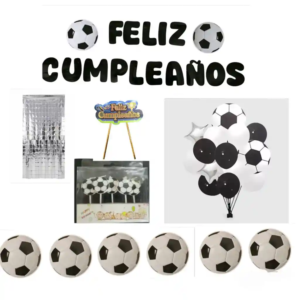 Banderin Feliz Cumpleaños Cartón color negro, Cortina 1 metro de ancho x 2 metros de largo en papel metalizado color plateado, set Vela de futbol x 5 Pcs, Set de Globo x 14 Pcs, Pin Para Torta de papel, Banderin papel futbol x 6 Pcs