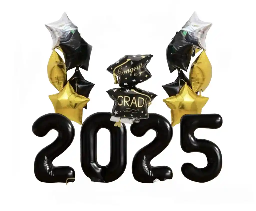 4 globo metalizado numero color negro 32", 1 globo grado 81x 49 cms negro, 4 globo metalizado estrella color dorado 18", 4 globo metalizado estrella color negra 18",2 globo metalizado estrella color plateado 18"