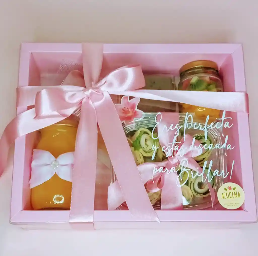 CONTIENE: JUGO DE MANDARINA MIX DE FRUTAS DE TEMPORADA BROWNIE CON AREQUIPE WRAPS DE JAMÓN Y QUESO, ROSA ETERNA CUBIERTOS CAJA CON TAPA DE ACETATO DECORADA CON MENSAJE Y LISTÓN Día de la mujer, cumpleaños, aniversario, amor, día de la secretaria