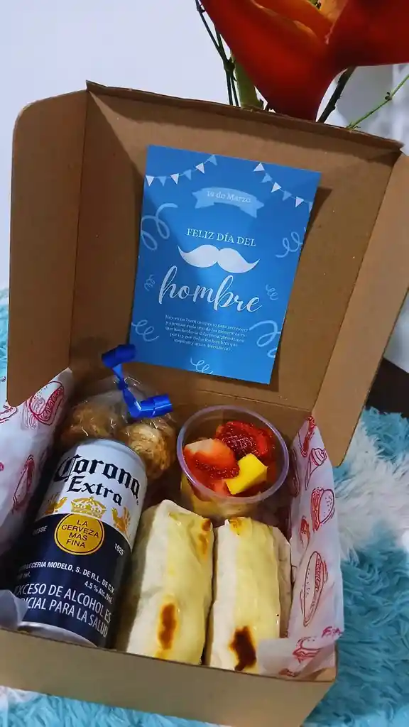Caja con cerveza en lata, 2 wraps (lechuga, pollo desmechado, tocineta, madurito, queso y salsa), fruta picada, 2 corazones hojaldrados, caja decorada con tarjeta y moño