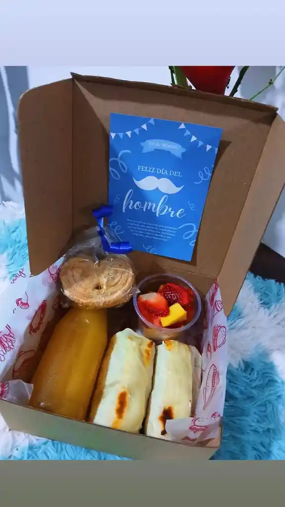 Caja con jugo de naranja, 2 wraps (lechuga, pollo desmechado, tocineta, madurito, queso y salsa), fruta picada y 2 corazones hojaldrados, caja decorada con tarjeta y moño.