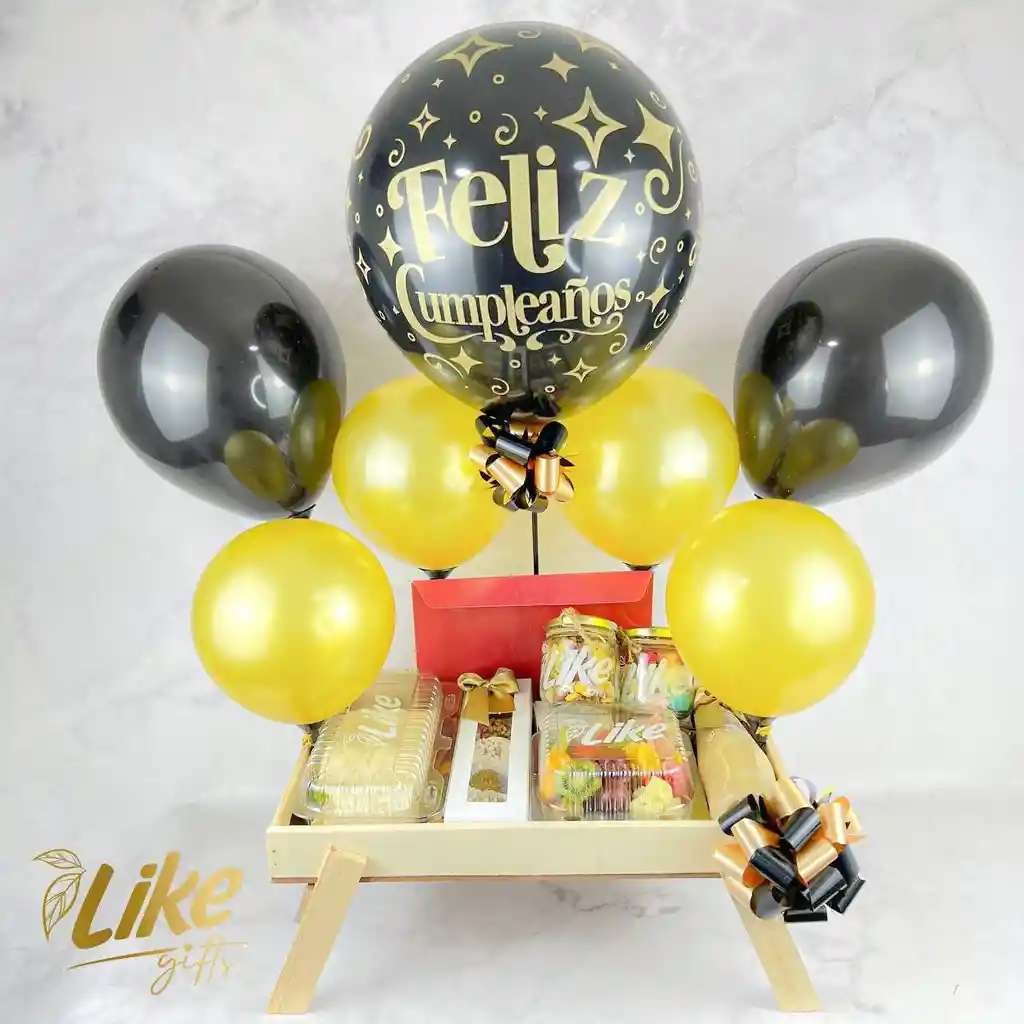 Deléitate con suculentos rollos de pollo, maridaje perfecto, chocolates premium y una selección de frutos secos, un delicioso capuccino, todo presentado en una hermosa canasta de madera. Además, para añadir un toque de alegría, incluimos globos festivos. Regala momentos de sabor y diversión con este desayuno que encantará todos tus sentidos. Contenido: 3 Rollos de pollo grandes. 1 Maridaje (quesos, jamones y frutas). 1 Caja de alfajores y trufas con chocolates x 5 unds. 1 Frasco de frutos secos. 1 Frasco de dulces y chocolates. 1 Capuccino 300ml. 1 Canasta de madera premium (estilo desayuno a la cama). Decoración con globos y moño. Presentación: Bandeja de madera con soportes y moño.