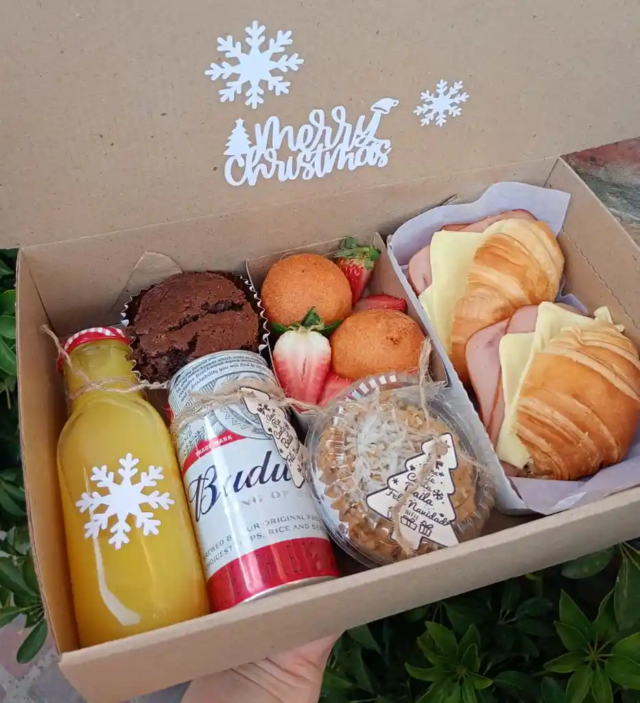 Lindo detalle navidad con pan hojaldrado con tomate, jamon y queso, buñuelos, natailla arequipe, fresas, torta de chocolate, cerveza y bebida a elegir, caja de navidad