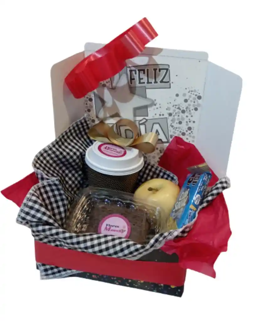 caja de merienda con brawnie, cafe latte, galletas y una linda presentacion , ideal para sorprender, en un cumpleaños o para hacer un dia o tarde especial , incluye tarjeta con tu mensaje personal