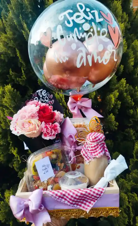 contiene: - Sanduche Cubano - Picada de frutas - Postre frio - jugo natural -caja decorada