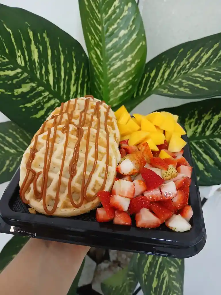 Waffles con fruta y arequipe, bandeja decorada con globo corazón y tarjeta personalizada.