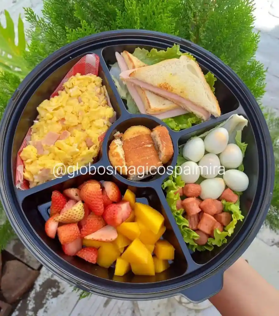 Huevos revueltos con jamón, sándwich, mix de frutas, huevos de codorniz y salchicha ranchera con salsa rosada, ponqué pequeño, bandeja decorada con moño, tarjeta y globo con helio.