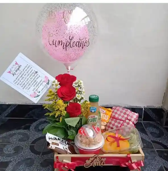 DESAYUNO SOPRESA INCLUYE ARREGLO FLORAL, GLOBO , TARJETA,MESA, SANDUCHE, JUGO, FRUTAS, GALLETAS, UN DULCE.