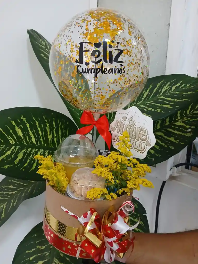 Sándwich, jugo de naranja, maní, bonyurt mini, caja decorada con globo burbuja pequeño, moño, tarjeta