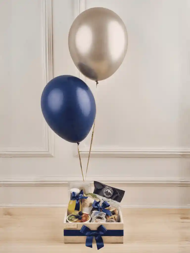 Caja cuadrada de madera (¡guárdala y reutilízala!), incluye: 2 globos de helio jugo de naranja o smoothie de... Ver más