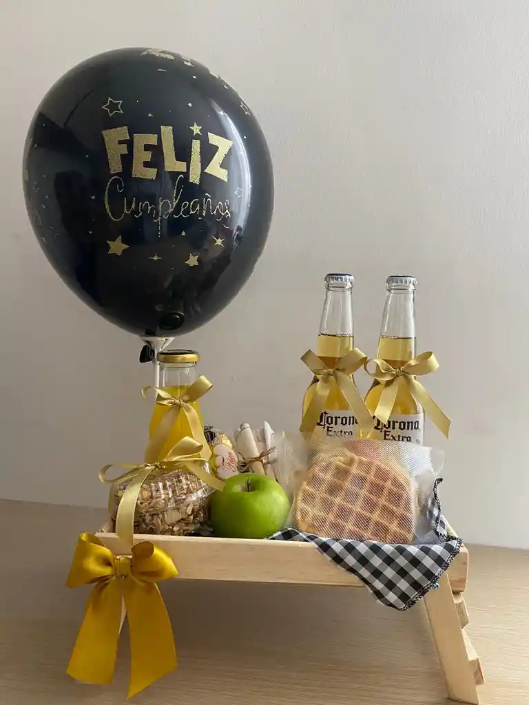 Sorprende con amor, ternura y sabor. Tarjeta personalizada GRATIS Bandeja de madera. Bomba decorativa Sanduche o mini wafles Fruta Jugo o bebida caliente Cervezas Chocolates.