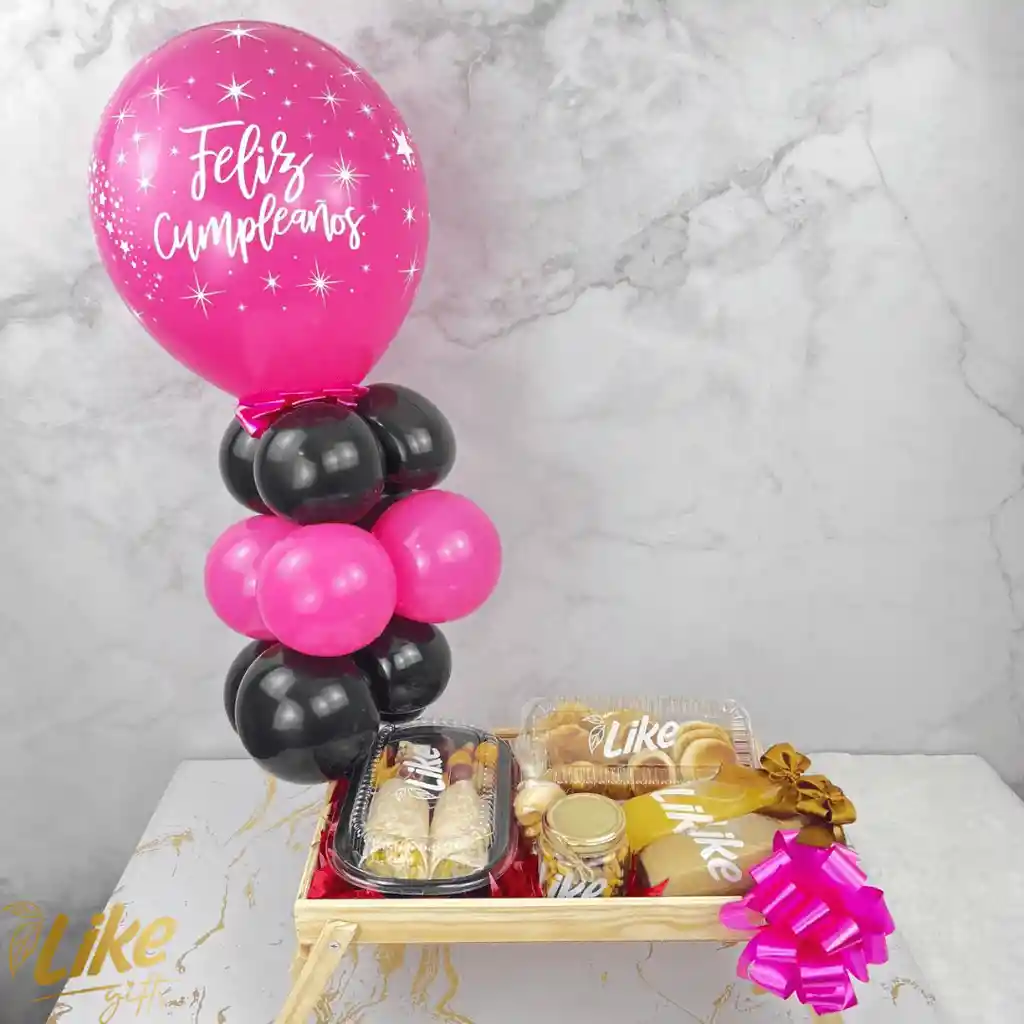 Llena de globos que transmiten valentía y un delicioso desayuno sorpresa, para brindar amor y valentía a una persona en un momento importante de su vida. Contenido: 2 Rollos de Pollo acompañados de un Maridaje con quesos, jamones y frutas. 1 Caja Panadería (Pan de quesos, Croissants, Pan Gourmet). 1 Frasco de Frutos Secos. 1 Capuccino 250ml. 1 Jugo de Naranja 250ml. 2 Paquetes de Galletas de Mantequilla. 1 Canasta de Madera Premium (Estilo Desayuno a la Cama). Decoración Femenina con Globos y Moño. Presentación: Bandeja de Madera con Soportes y Moño.