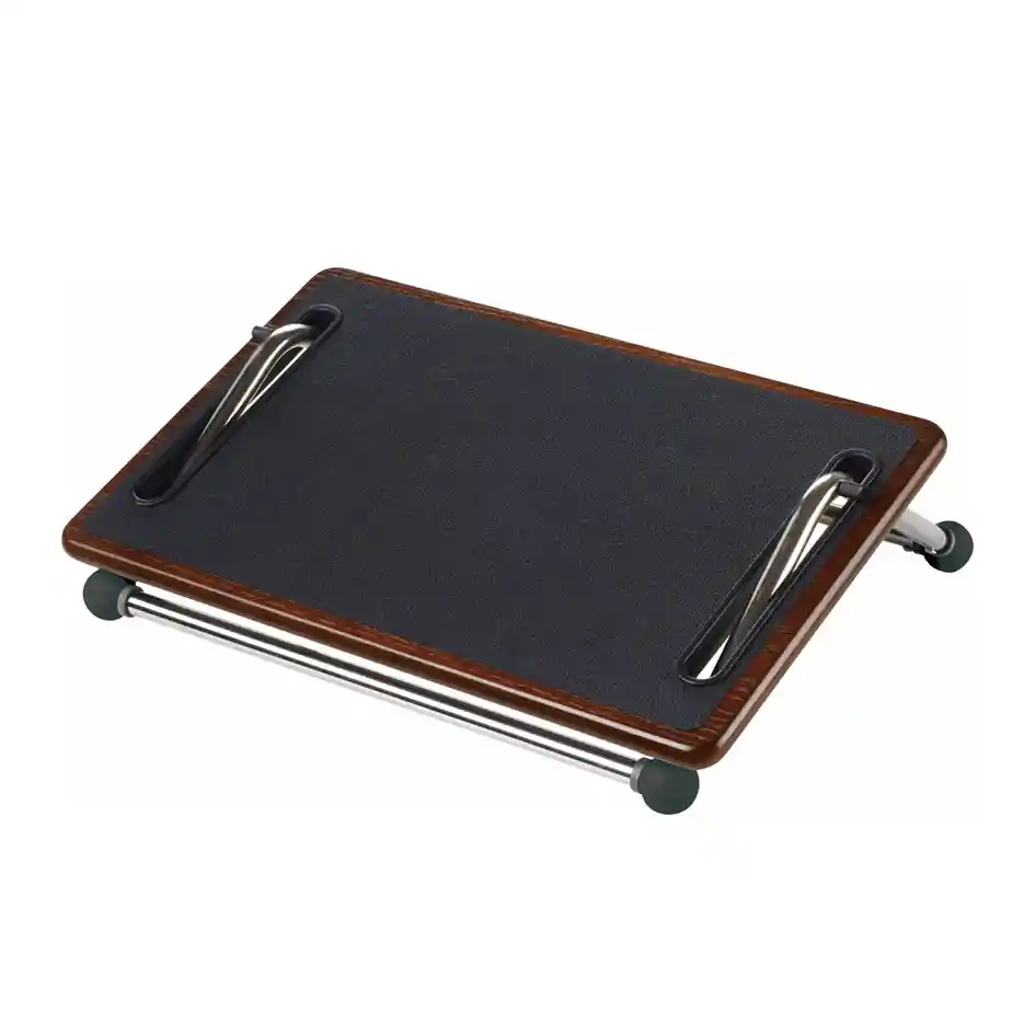 Compuesto por dos piezas independientes y con topes en la estructura por lo tanto no se desbarata al moverlo. Superficie con textura que evita que los pies se deslicen. Fácil limpieza. Material: Superficie en madera aglomerada (MDF), superficie en caucho corrugado antideslizante, estructura en tubo cromado y base con topes en caucho antideslizante. Altura horizontal max 10cm, Altura ángulo max 15cm Dimensiones: 48 x 36 x 13 cm y superficie de apoyo: 48 cm de ancho x 36 cm profundidad x 2,2 cm espesor. Ajustes: Ángulo: desde 0° hasta 40° Garantía: 1 año por defectos de fabricación.