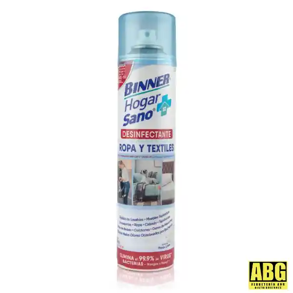Desinfectante Ambientador BINNER Aire Sano para textiles: Cuenta con la capacidad de eliminar el 99,9% de virus como rotavirus e influenza A(H1N1), la causante de gripe y otras enfermedades respiratorias; también eliminando bacterias, hongos y moho.