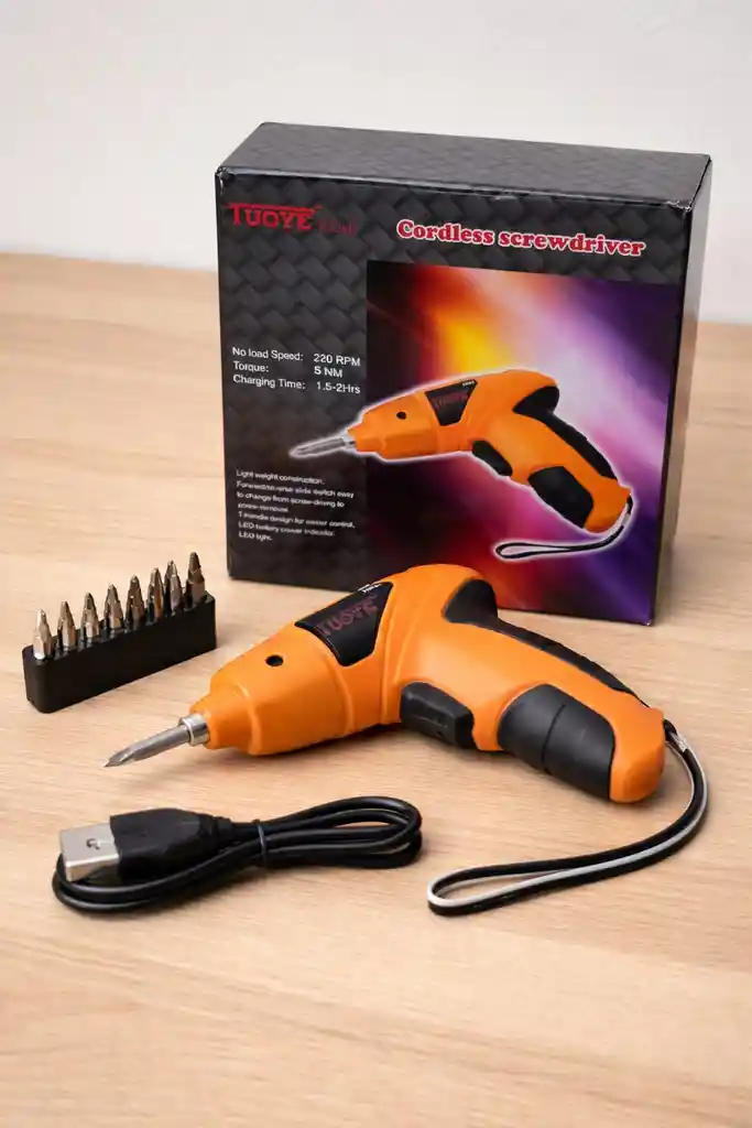 🔧 Destornillador Inalámbrico TUOYE ✅ Potencia eficiente Torque: 5 Nm, ideal para trabajos domésticos, muebles y reparaciones. ⚡ Buen rendimiento Velocidad sin carga: 220 RPM, permite atornillar de forma rápida y precisa. 🔋 Batería recargable Tiempo de carga: 1.5 a 2 horas Carga mediante cable USB (práctico y universal). 💡 Iluminación LED Luz integrada para trabajar en espacios con poca visibilidad. 🔄 Función reversible Giro hacia adelante y reversa para atornillar y desatornillar fácilmente. 🖐️ Diseño ergonómico Mango cómodo y antideslizante para mejor control. Ligero y fácil de manejar. 🔩 Accesorios incluidos 10 puntas intercambiables para distintos tipos de tornillos. 🎯 Uso ideal Reparaciones en el hogar Armado de muebles Trabajos eléctricos ligeros Proyectos DIY