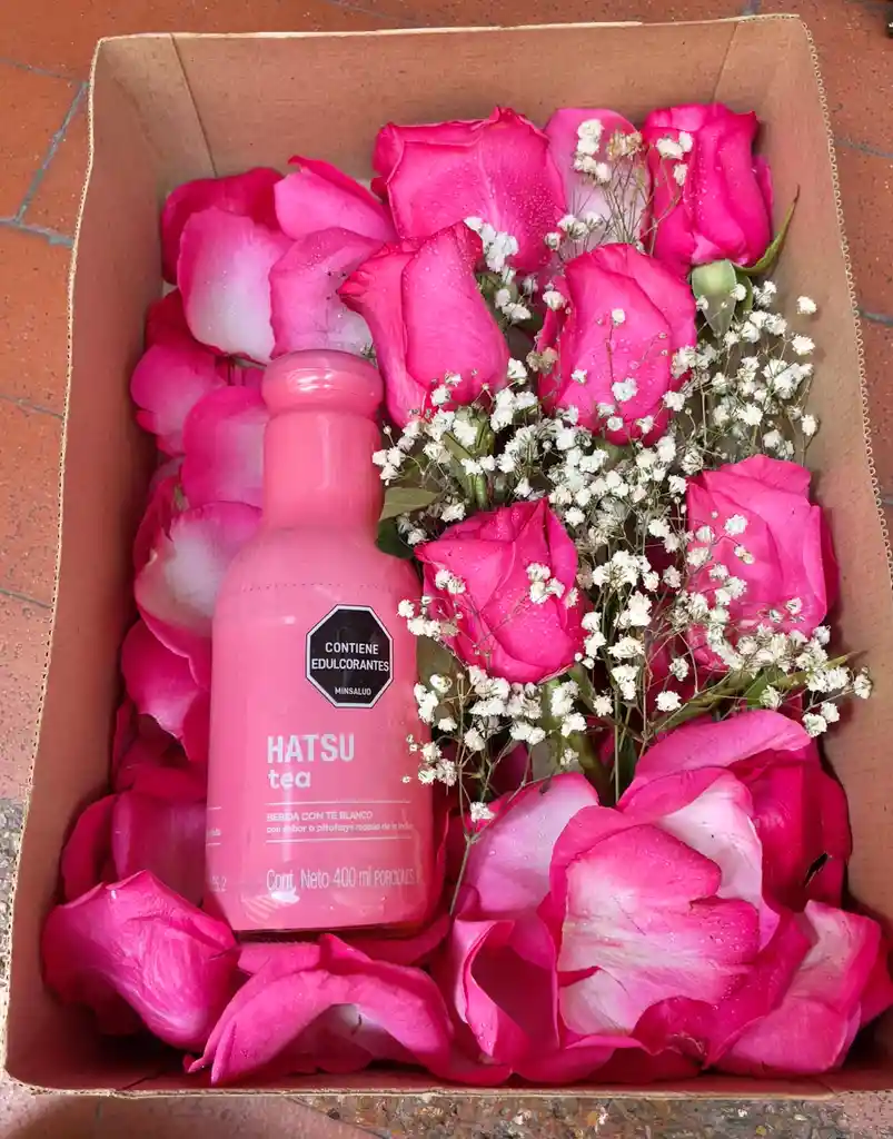 😍 Sorprende con el regalo perfecto: rosas frescas + pétalos + Hatsu Tea rosa. Un detalle romántico, único y disponible para entrega inmediata en tu ciudad.