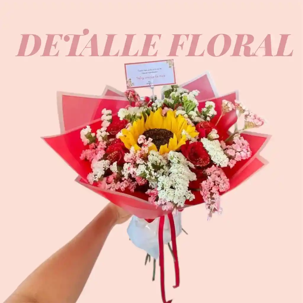 Ramo pequeño elaborado con 1 girasol natural acompañado de flores variadas frescas, cuidadosamente combinadas y envueltas para una presentación delicada.Incluye tarjeta personalizada.
