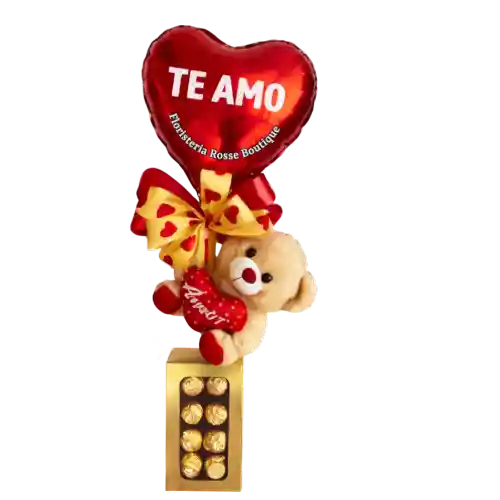 Hermoso detalle romántico que incluye 8 chocolates Ferrero Rocher, un tierno peluche y un globo con mensaje “Te Amo”. Una combinación ideal para sorprender en aniversarios, cumpleaños, San Valentín o simplemente para recordarle a esa persona especial cuánto la amas.