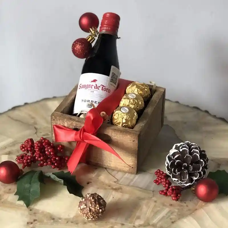Cajita con mini vino, chocolates y tarjeta personalizada. Sorprente con amor y elegancia